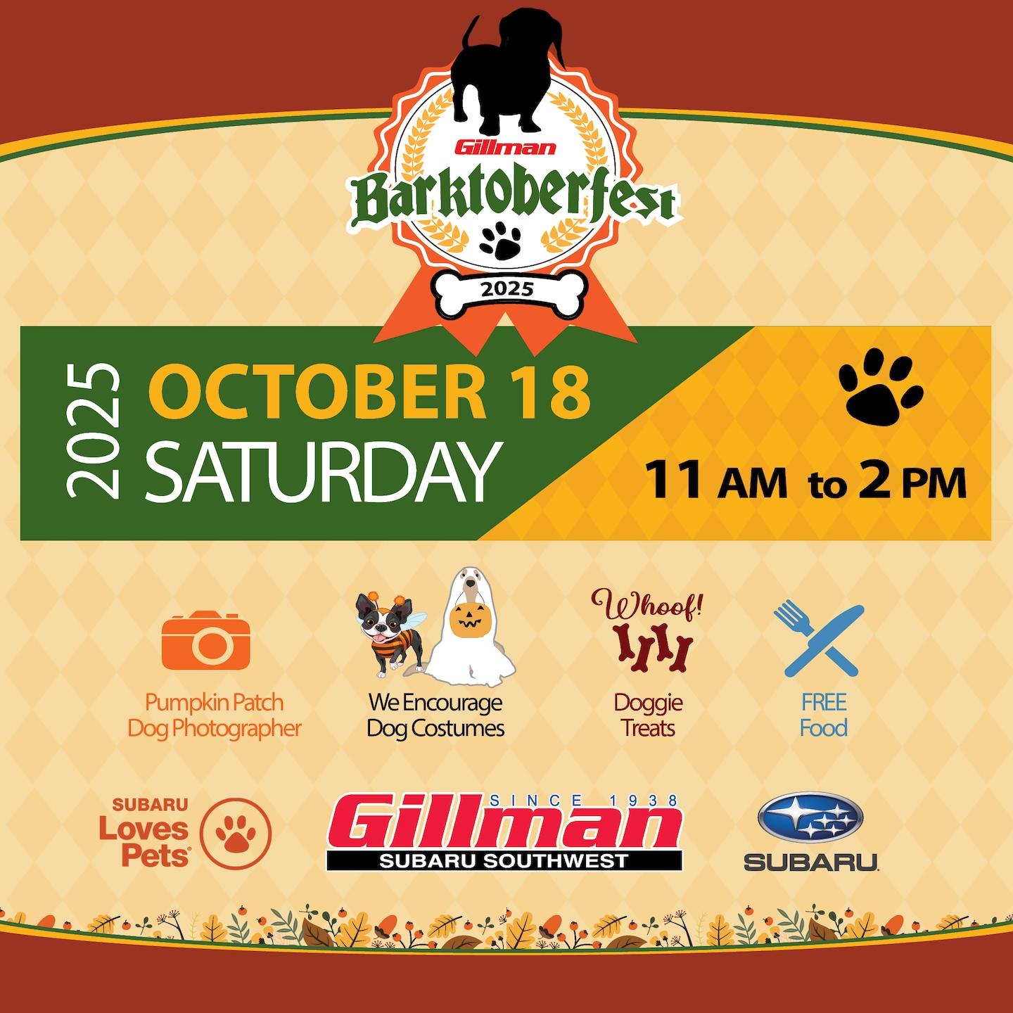 Join us here for our annual Barktoberfest event at Gillman Subaru Houston. We will have FREE food and coffee for owners along with FREE dog treats, pet photography, and fun for all dogs!